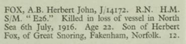 Herbert Fox - His brother Herbert, an Able Seaman in the Royal Navy, also died on 6th July 1916 during the terrible Battle of Jutland. The son of Herbert Fox of Gt Snoring. Commemorated on Portsmouth Naval Memorial, Panel 12.